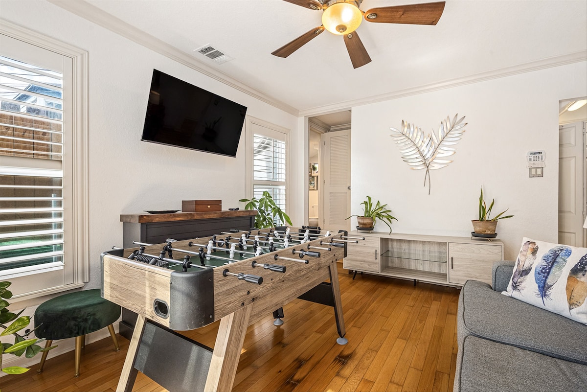 ¡Crea recuerdos en esta casa única y hermosa en el corazón de Midtown Houston! Esta casa cuenta con una gran piscina privada situada en un lote extragrande en una gran zona de Houston. Obtendrás la comodidad de la ubicación de Midtown con el espacio de una casa suburbana. Midtown es una de las MEJORES áreas para alojarse en Houston si quieres ver todo lo que ofrece la ciudad. Puedes llegar fácilmente al NRG/Rodeo a través de la estación de Lightrail, que está a 9 minutos a pie. ¡Evita el estacionamiento o el tráfico limitado con Ubers/taxi!