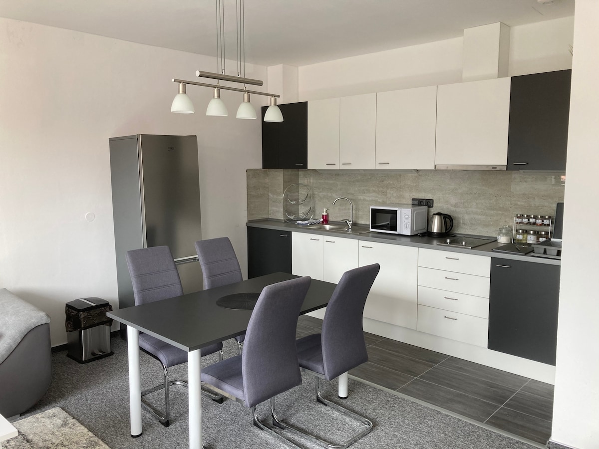 Kvalitní ubytování s parkováním u domu a rychlým spojením do Brna. Je vhodné pro páry nebo kolegy, kteří potřebují oddělené postele. V této klidné části města se dobře vyspíte. Pohodlné postele s lamelami jsou dlouhé 2,2 m a třetímu hostu nabídneme matraci. Moderní kuchyň s klimatizací je vybavená obvyklými předměty, ale TV tady není. V koupelně najdete prostorný sprchový kout. Byt působí uvolněně a relaxačně, s velkým důrazem na čistotu a hygienu. Na vyžádání vám rádi vystavíme fakturu.