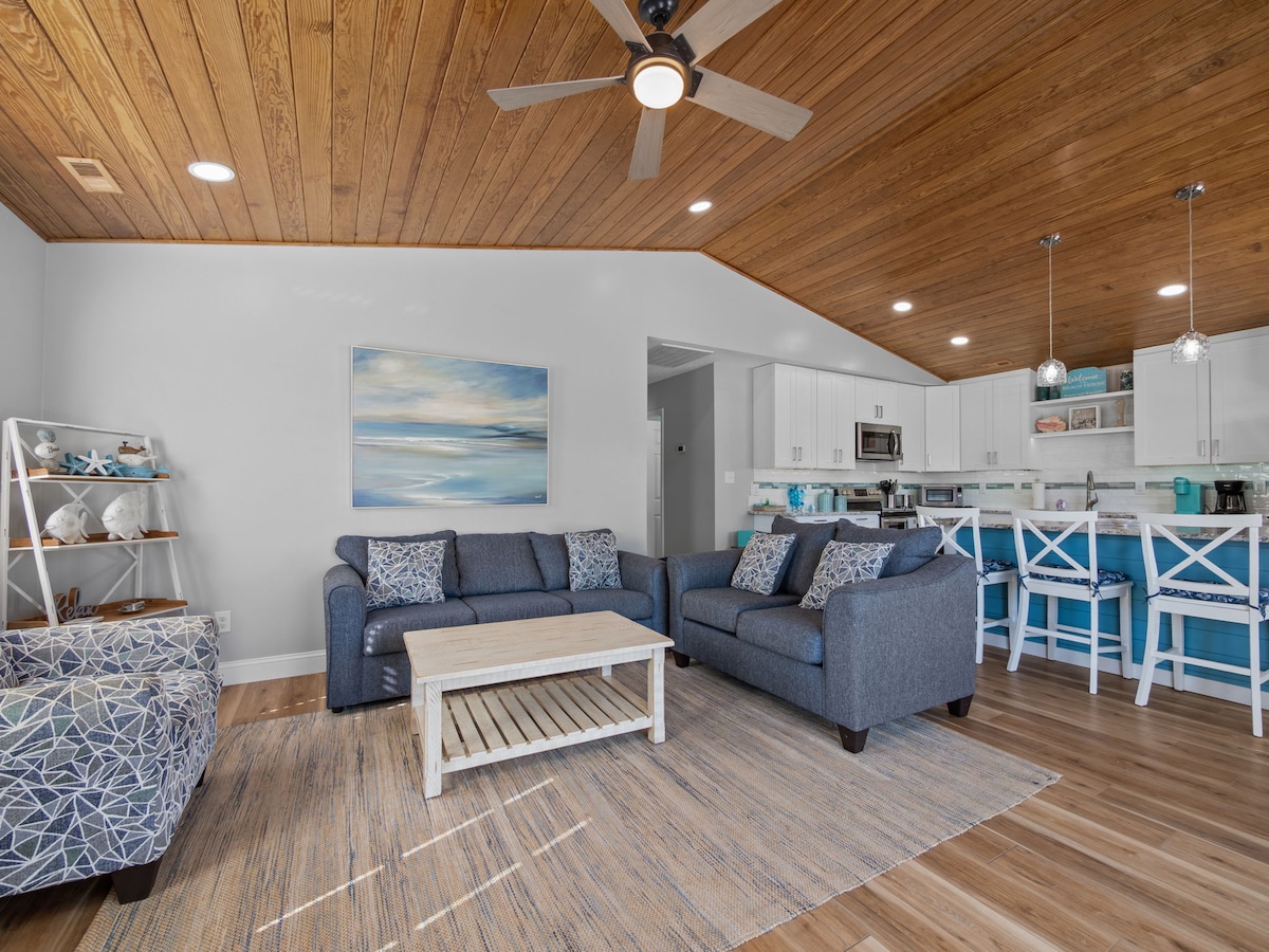 Siéntate frente al mar con vistas panorámicas a una playa poco concurrida y delfines en el oleaje. Disfruta de nuestra cocina totalmente equipada, tocadores de baño completamente nuevos con encimeras de granito, camas cómodas y una casa acogedora. EI es ideal para nadar, andar en bicicleta, navegar, pescar o simplemente relajarse. Lado este de la casa dúplex. Debes tener 25 años o más para reservar nuestro alojamiento.