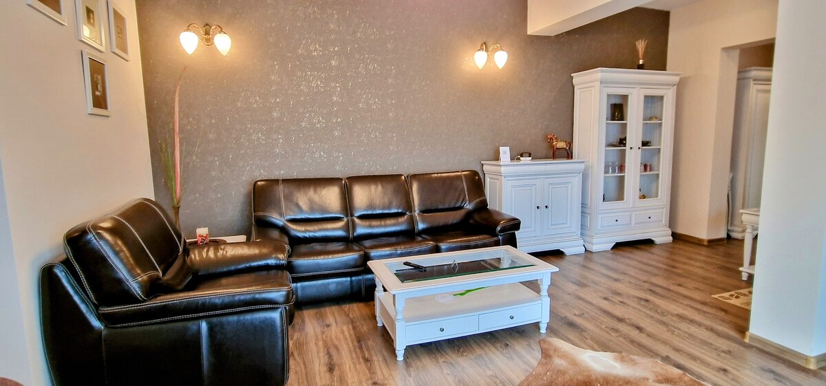 Charming and luxury apartment in a Central Vila in Sinaia has two bedroom with double beds (one with a convertible sofa bed), a bathroom and a fully equipped kitchen (fridge,microwave oven, coffee machine,washing machine,plates ) with an extensible table seating 5 people.There is a big parking and a lovely garden for our guests to use. The Villa is located in the heart of Sinaia, a 5 minutes walk from Peles Castle (one of the most beautiful in the world) and 45 a minute drive to Bran Castle.
