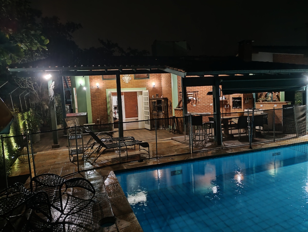 Llamamos a nuestra casa “Entre Águas e Montes: Refúgio Guarujá” por su ubicación y sabroso perfil para parejas y familias. La casa está en una comunidad cerrada ("Condomínio Albamar") a poca distancia a pie del campo de fútbol, la cancha de tenis, el parque y la pista de deportes mixtos. La casa ha sido recientemente renovada e incluye una piscina privada, barbacoa, aire acondicionado (habitación principal), ventiladores de techo en cada habitación y un acogedor balcón con hamaca y arreglos de vida.