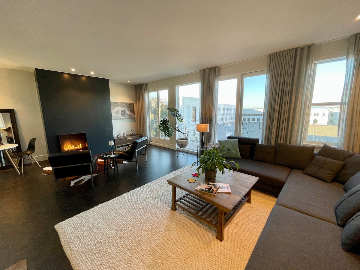 Gran suite King soleada con espacio de trabajo, sala de estar, cocina