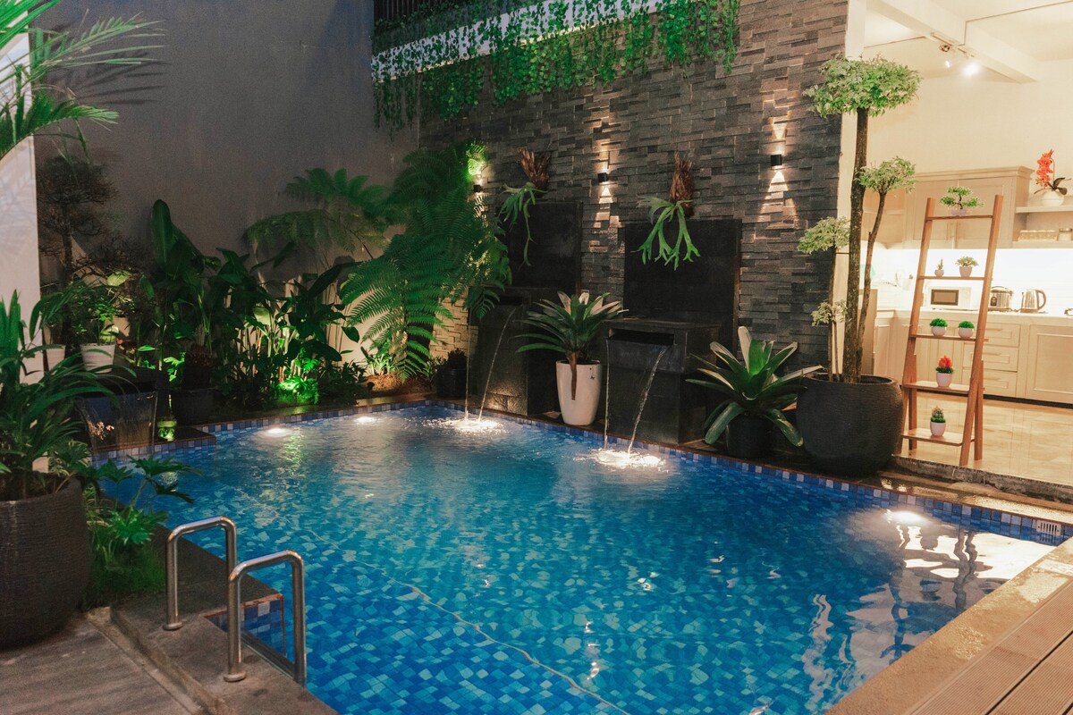 Disfruta de un alojamiento acogedor y tranquilo con tu familia mientras disfrutas de varias instalaciones que incluyen piscina, wifi, televisores y un columpio al aire libre. - A 3 minutos de la cabina de peaje Singosari. - A 20 minutos de la ciudad de Malang. - A 40 minutos de la ciudad de Batu.