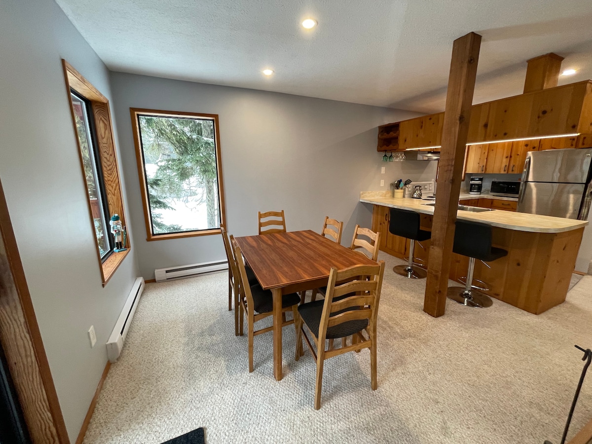 ¡Ven a disfrutar de la comodidad de esta unidad superior recientemente renovada en la ubicación perfecta! Esquí en esquí a un tiro de piedra del estacionamiento. Disfruta de este alojamiento de 2 dormitorios con un espacioso loft. 8 camas en total con azulejos nuevos con calefacción en los baños, ducha personalizada y vestidos de barro. Cocina nueva con encimeras de cuarzo y totalmente equipada. ¡Caliéntate en la sauna después de un día frío en la colina! ¡Quiero reservar ambas unidades, echa un vistazo a nuestra unidad inferior (Black Bear Suite) si quieres reservar todo el chalet!