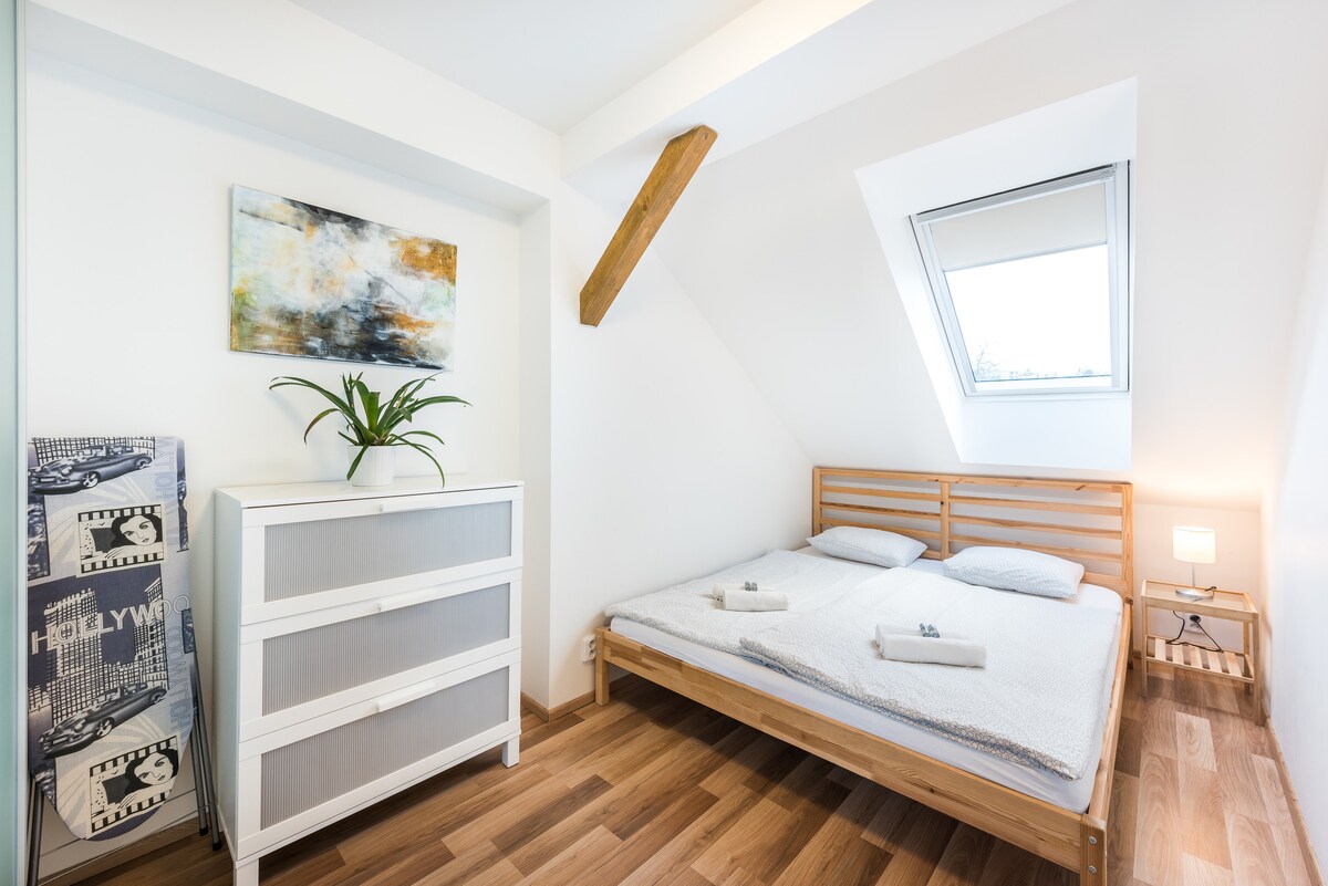 The new air-conditioned attic apartment features a double bed and a sofa bed that provides two additional sleeping areas. Includes a fitted kitchen, bathroom with shower, washing machine, hairdryer and iron. The whole apartment is covered with high-speed wifi. Cable TV is available, including HBO. Nearby is the restaurant Svatoboj, food, a popular cycle path with beautiful nature and one of the best wellness in Brno - 4comfort. We offer self-check-in!