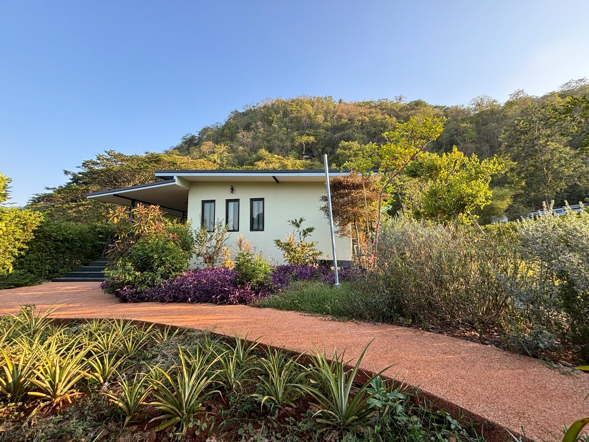 Kick back and relax in this calm, stylish space. A cozy A-frame cabin nestled on the hill of a small mountain. You will enjoy panoramic view of Khaoyai mountain which is less than 30 minutes drive. Restaurants, shops, and attractions are minutes away Free breakfast can be enjoyed anywhere; in the garden or on a deck overlooks the mountain. The fire-pit is steps away from your door. You can enjoy seating and strolling in the garden. The property manager will be around in case you need anything