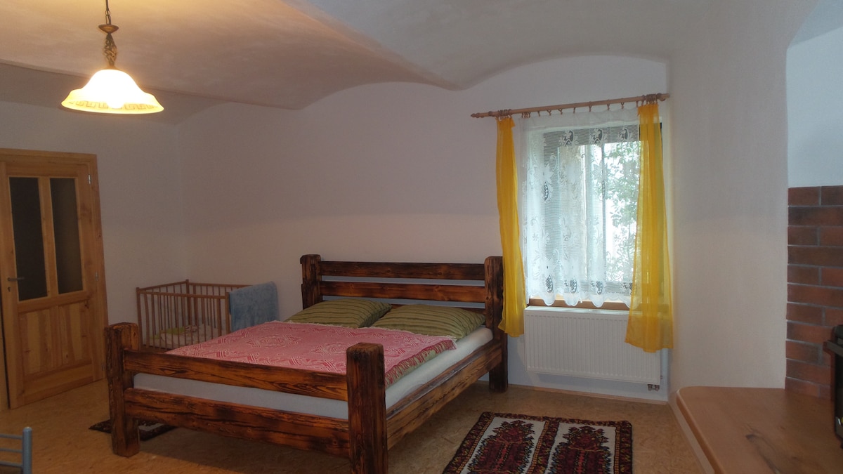 El departamento está en un pequeño pueblo tranquilo cerca de la ciudad de Český Krumlov. Esta es una habitación grande con una gran cama doble, una cuna y 2 veces una cama adicional, una mesa de madera, un banco en la esquina, un tocador, una cocina pequeña en numerosas comodidades (un pequeño horno con una inducción: 2 platos calientes, un refrigerador, un microondas, un hervidor eléctrico), un gran baño con una ducha, una entrada privada, un pasillo. El apartamento tiene 55 m2. Estamos ubicados en las estribaciones de Šumava, desde el apartamento a 500 m hasta el bosque (Blanský les).