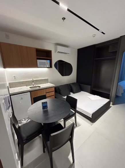 La mejor suite para luna de miel o para hospedar con toda la familia. ¡Nadie duerme en el piso! Una cama tamaño queen + 3 camas individuales, todas diseñadas por un arquitecto, alojamiento súper cómodo. Hay una encimera para computadoras portátiles y un tocador para que las mujeres adornen aún más. ¡Armario con espejos y cocina completos con platos y ollas de Tramontina! Resort frente a la playa, gimnasio, sauna, restaurante, ocio.81986952133