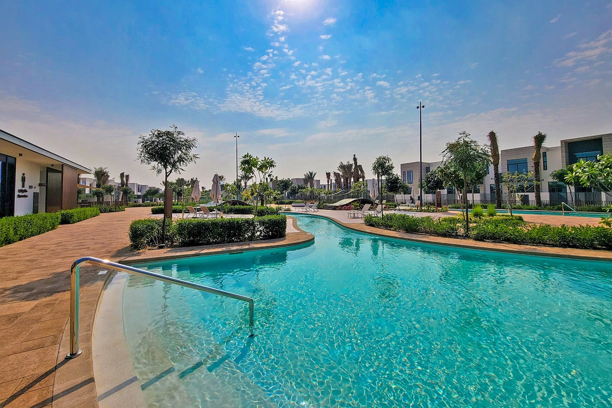 Welcome to your perfect resort-style escape. This beautifully located villa sits in front of the lazy river pool, offering a prime front-row view with effortless access. Set within a peaceful community, guests enjoy state-of-the-art facilities including a modern gym, beautifully landscaped surroundings and adventure-filled kids' play areas Whether you’re looking to unwind, spend quality time with family, or explore Dubai, this villa offers the perfect balance of comfort, nature, and convenience.
