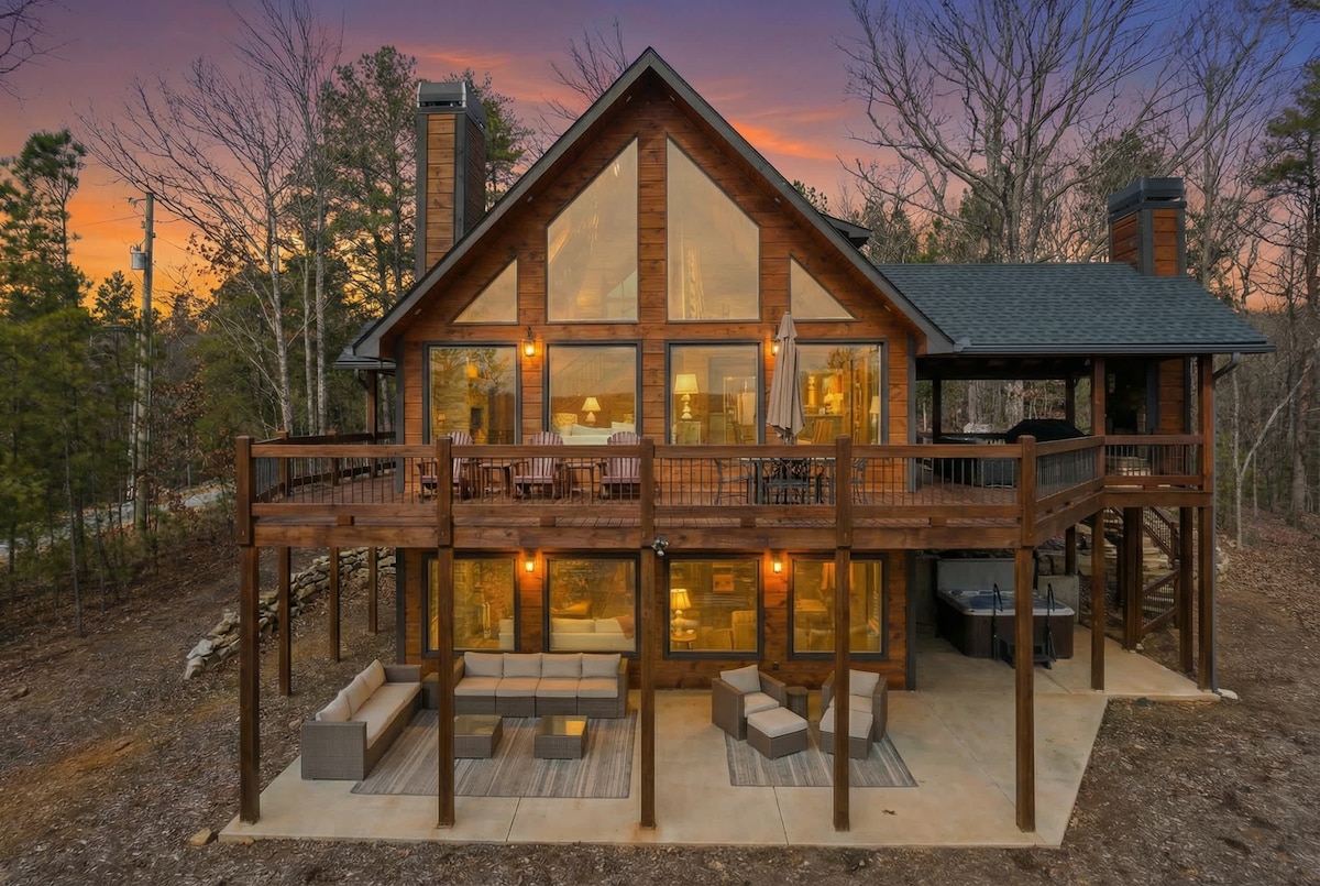 Escápate a esta impresionante cabaña alpina ubicada en el corazón de Ellijay, Georgia. Este refugio contemporáneo cuenta con un acogedor diseño abierto con una acogedora estufa de leña. El elegante interior cuenta con una cocina totalmente equipada, cómodas zonas de estar y una escalera de caracol que conduce a un loft abierto. Relájate al aire libre en la bañera de hidromasaje bajo las estrellas o reúnete alrededor de la chimenea al aire libre. Una gran terraza ofrece un amplio espacio para descansar, cenar o simplemente disfrutar de los sonidos tranquilos del arroyo cercano.