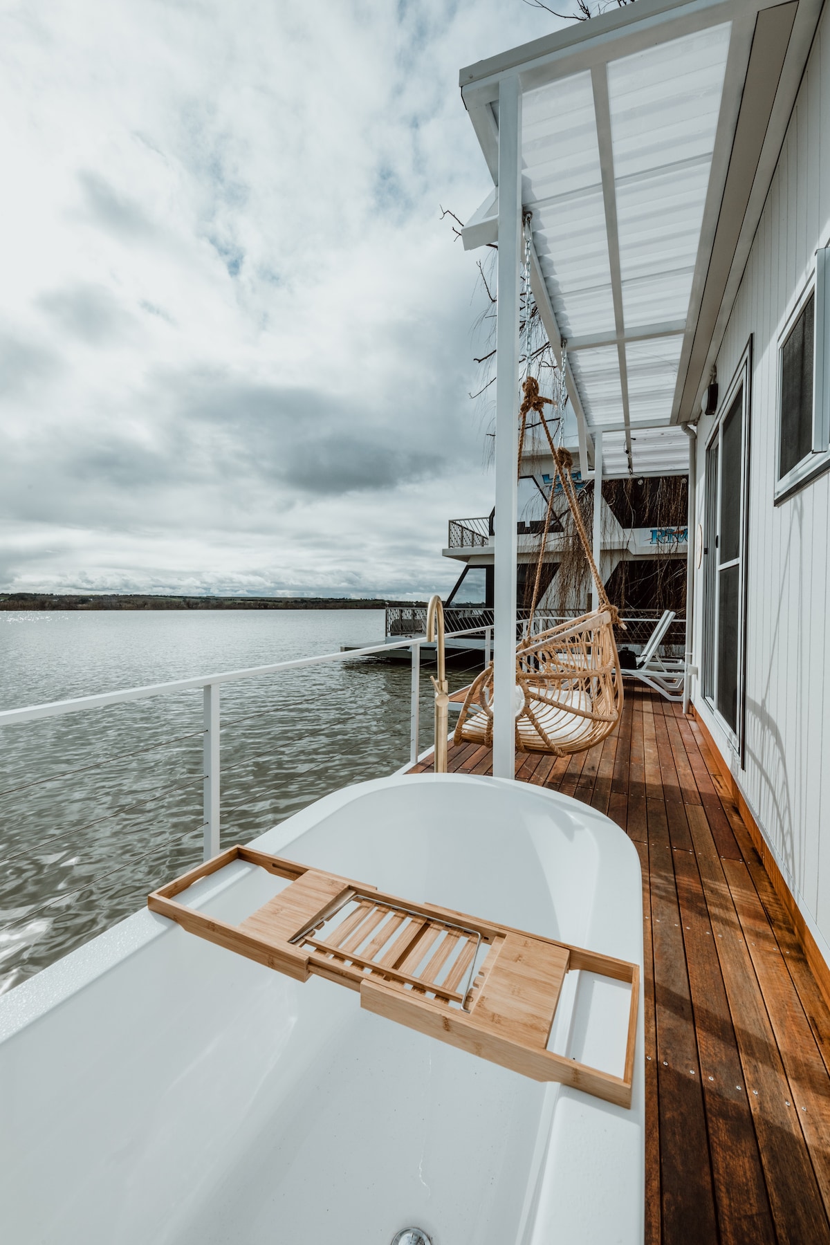 La Floathouse es una pequeña casa de lujo flotante en el río Murray que ofrece una experiencia única y romántica a una hora de Adelaida. Las características incluyen un baño al aire libre, cama tamaño queen, sofá, wifi, baño privado con inodoro/ducha, gran terraza con tumbonas, mesa de comedor, columpio doble, plataforma de natación separada y una barbacoa para aquellos que quieran aprovechar al máximo las vistas al río. Nuestra pequeña cocina está equipada con todo lo necesario para preparar comidas. La casa flotante está amarrada permanentemente dentro de un puerto deportivo cerrado.
