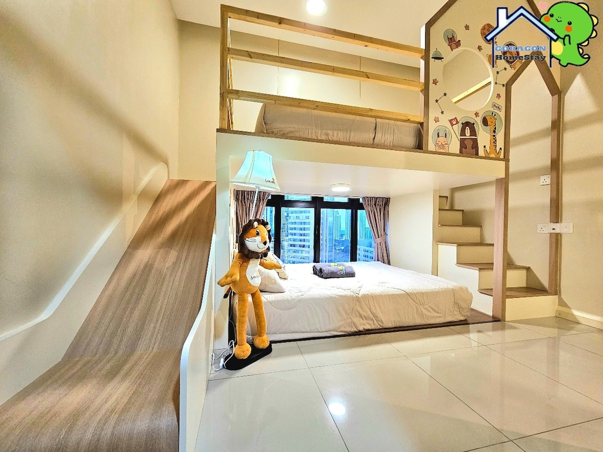 A 8 minutos de Legoland.🚗🧸 A poca distancia a pie 👣 de Sunway Big Box🛍️, GSC Cinema🎬, KFC, Starbucks, Family Mart, X Park, etc. Adecuado para 4-6 personas.👪 En la habitación 1 cama tamaño queen 2 camas individuales 1 sofá cama tamaño queen Parque infantil con tobogán Salón con proyector Comedor Cuarto de ducha. Cocina En el apartamento Máquinas expendedoras Parque infantil Piscina Gimnasio Zona de yoga Cancha de baloncesto Sala de juegos Zona de barbacoa.