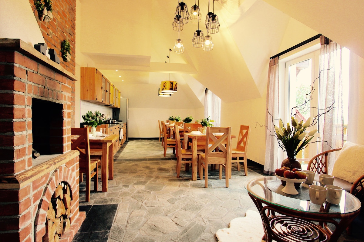 We invite you to our Zarabie Residence. The villa is located 20 minutes from Cracow and 80 minutes from Zakopane by car. We offer 5 bedrooms for 17 people , 2 bathrooms, an equipped kitchen with a dining area, a living room with a bar and a fireplace. Our guests can use the grill and the jacuzzi and sauna located in the garden. The villa is located in a quiet, green area. Nearby you can find grocery stores, restaurants, a swimming pool, a ski lift, a park with playgrounds for children.
