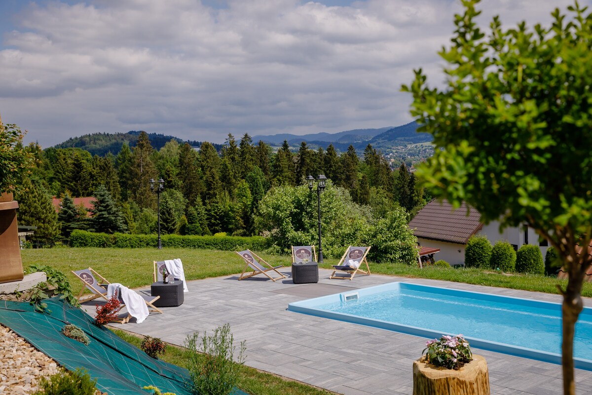 Una casa con un tronco en alquiler - Glade Słowikowa. Alrededor de los árboles, la vegetación y las aves te hará sentir especial aquí. Los hermosos ventanales grandes te hacen sentir espacioso aquí. Todo es nuevo y está diseñado para hacerte sentir aún mejor aquí que en casa. Nos hemos preocupado por la comodidad centrándonos en soluciones únicas y cómodas, como una piscina exterior con agua climatizada, un jacuzzi/balia en la terraza con aeromasaje e iluminación, una sauna, una playa con tumbonas y sombrillas y un parque infantil.
