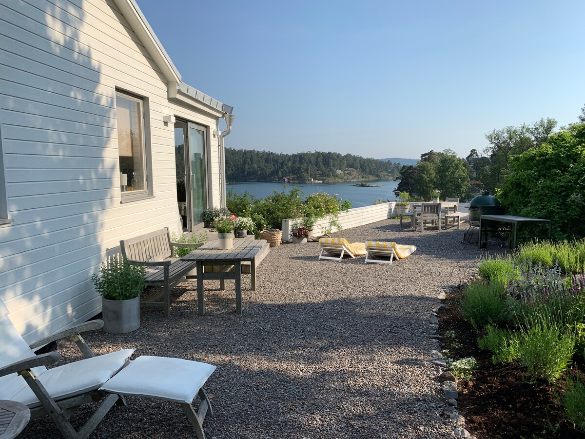 Una casa en una fantástica ubicación junto al mar a solo 10 metros del agua. Con vistas a la ensenada de Estocolmo verás pasar barcos y barcos fuera de la casa que tiene una terraza hacia el mar. La cabaña está a solo 12 km del centro de Estocolmo y está aislada del edificio principal donde vivimos nosotros mismos. Las reservas naturales para pasear y correr están a un paso de la cabaña. La bañera de hidromasaje de leña que está en nuestro muelle se puede alquilar por una noche. Existe la posibilidad de alquilar kayaks de mar (2).