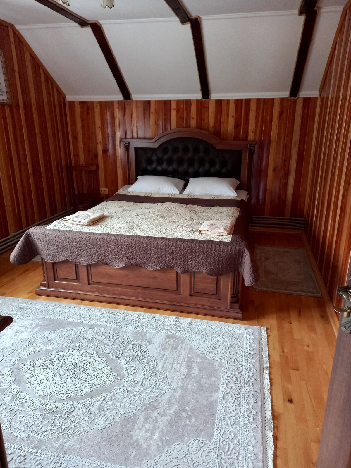 Hay una casa de madera en alquiler. Cocina en la planta baja ( con todos los suministros necesarios). En el segundo piso hay tres dormitorios (cama doble, TV, armario, cajonera) baño en el suelo. Wifi, estacionamiento. Comidas por acuerdo. El traslado está disponible. Pesca de truchas. Hay parrilla,cenador, cuna. Relájate con toda la familia en este acogedor lugar.