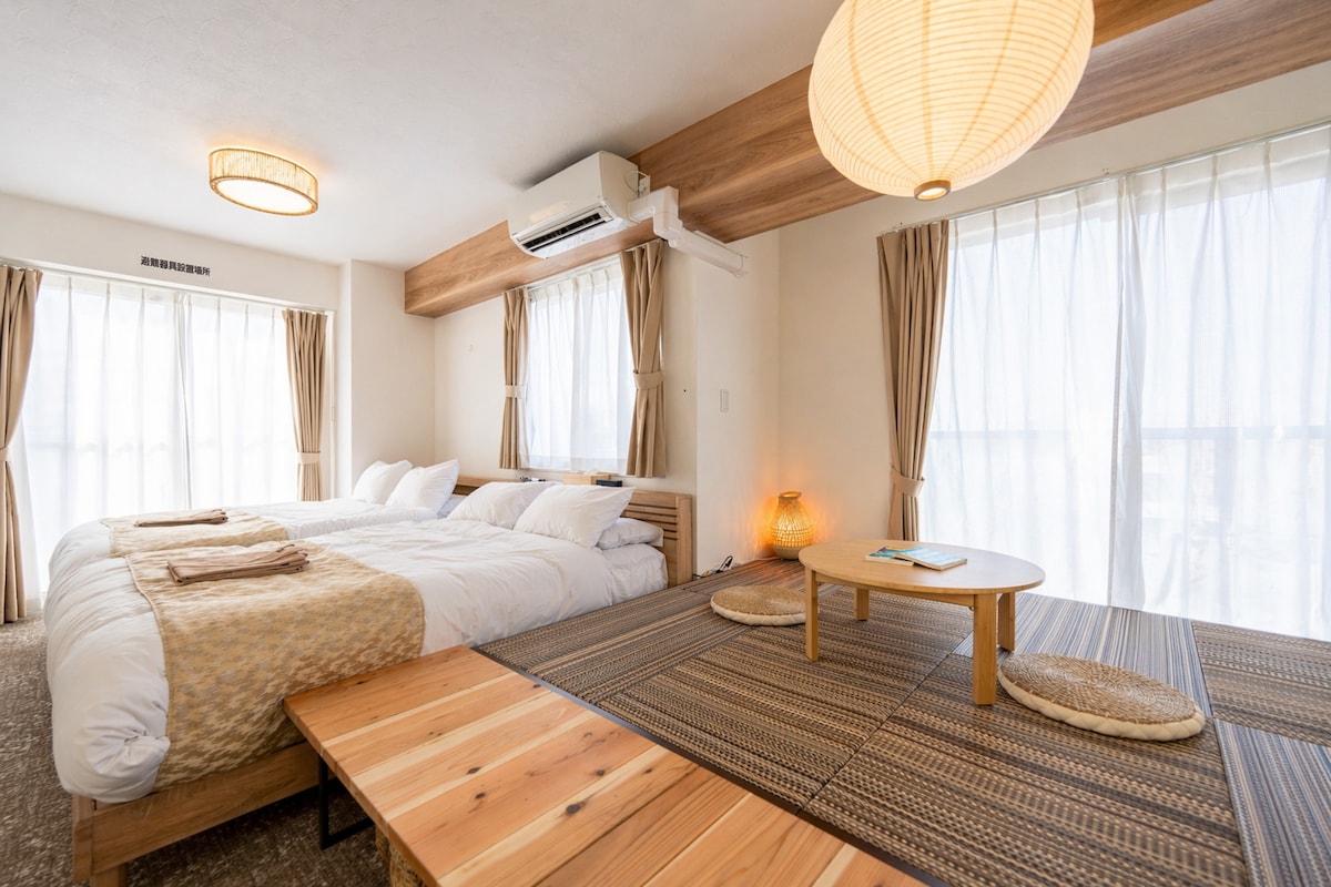 ¡Alójese en el corazón de Naha! A solo 10 minutos del aeropuerto en Yui Rail (estación Kencho-mae). No necesitas alquilar un coche. ※ Hay estacionamiento disponible en estacionamientos de pago cercanos. Se incluyen 3 bicicletas gratuitas. A 1 minuto de la calle Kokusai A 5 minutos de la playa de Naminoue A 15 minutos del Castillo de Shuri A 8 minutos del puerto de Tomari ¡Se explora mejor en bicicleta! Cómodo para 3 adultos. Hasta 4 huéspedes, incluidos los niños. ※No es adecuado para 4 adultos.