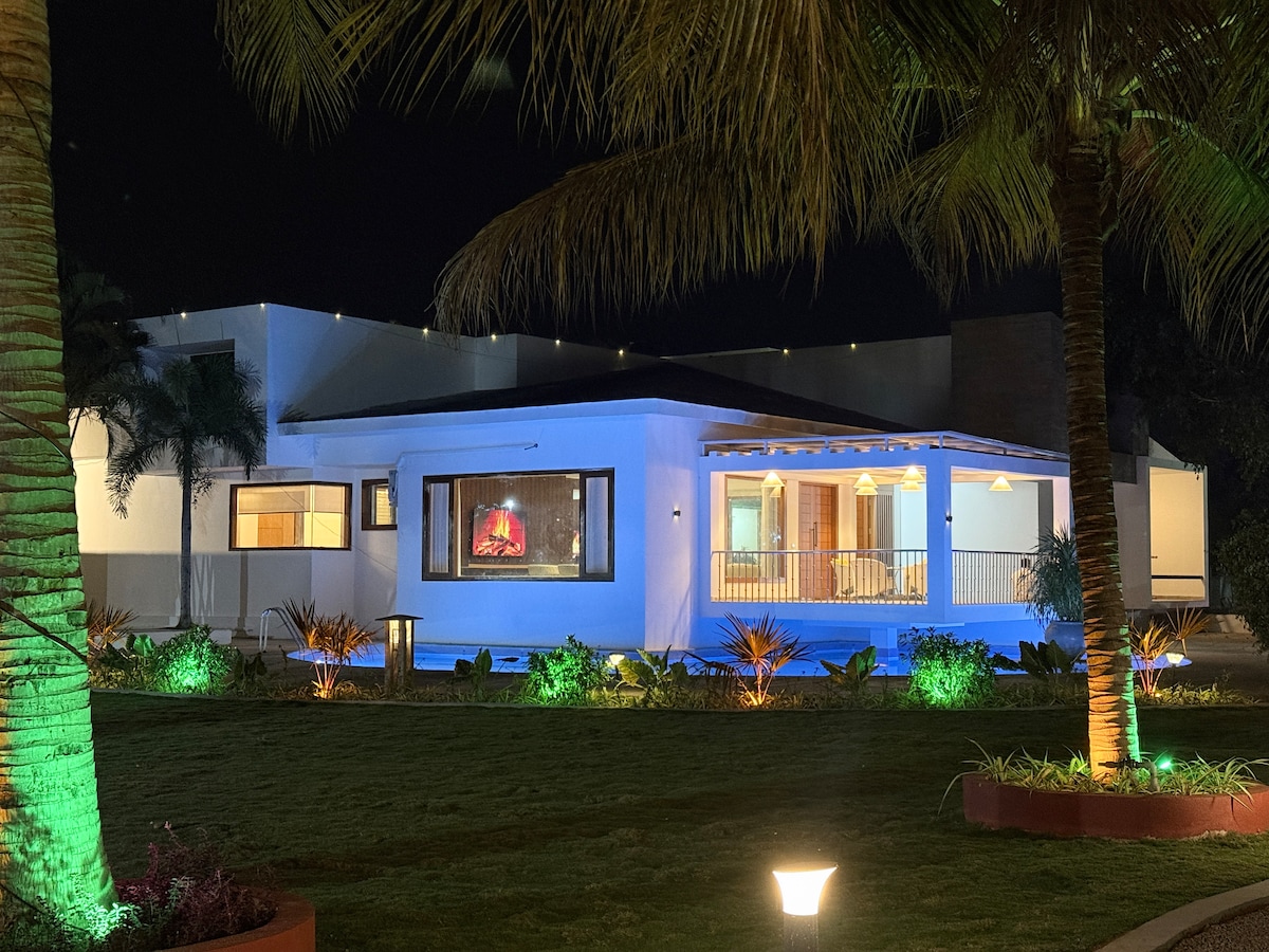 Escápate a una granja de nueva construcción situada en un huerto de mango de 7 acres a lo largo de Shankarpally-Chevella Road, a pocos minutos de Pragati Resorts. Este sereno refugio ofrece 2 acogedores dormitorios (perfectos para 4 huéspedes), una piscina privada, amplias zonas de comedor y salón, una cocina totalmente equipada, un espacio para fiestas al aire libre y un wifi ilimitado de alta velocidad. El amplio estacionamiento en el lugar agrega comodidad. Ya sea que busques relajación o una reunión divertida, esta granja proporciona la mezcla perfecta de comodidad y privacidad.