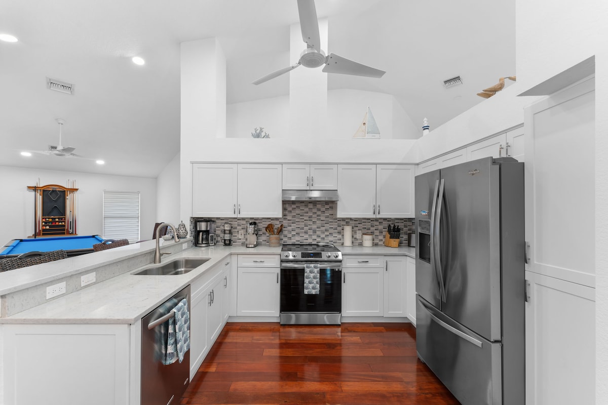 Descubre el escape perfecto a solo 8 min de las impresionantes playas de Naples. Esta tranquila casa vacacional de 3 habitaciones y 2 baños tiene todo lo necesario para unas vacaciones inolvidables. Los niños disfrutarán del cuarto de juegos, los adultos del billar, y todos amarán la piscina climatizada con spa, la acogedora fogata y la chimenea en la sala. Con capacidad para 9 huéspedes, es el lugar ideal para relajarse, crear recuerdos y disfrutar de los impresionantes atardeceres de Naples.
