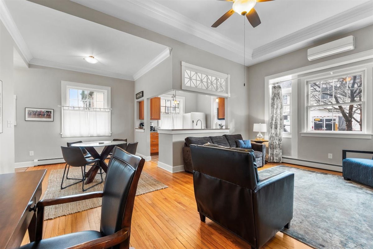 This unique second floor condo is flooded with natural light. Steps from Congress Park and downtown Broadway, and a short walk to the Saratoga Race Course. Skylights, hardwood floors, keyless entry, custom lighting, complete kitchen with stainless steel appliances, air conditioning, small washer/dryer all housed in an original Skidmore College building creating a quiet space in a residential neighborhood. On-site parking is included. Intimacy surrounded by all the excitement of Saratoga.