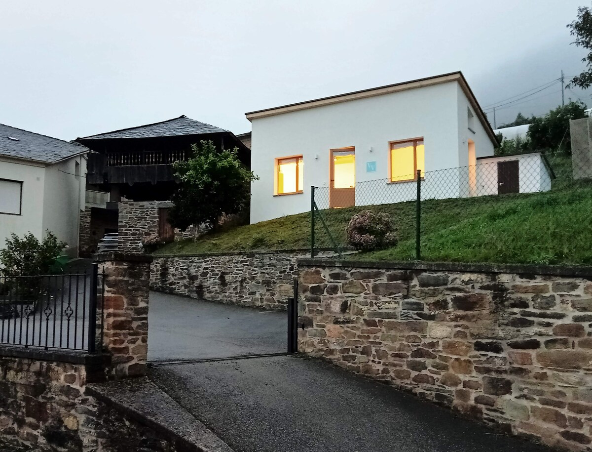 Casa en un entorno rural y tranquilo con aparcamiento, jardín, zona cubierta bajo un Hórreo asturiano donde comer y compartir con familia o amigos, o simplemente sentarte a desconectar. Tiene capacidad para 4 personas, aunque dispone de un sofá cama. Totalmente amueblada y equipada. Ideal para disfrutar de la naturaleza y las vistas que rodean la casa, con un río a escasos metros y rodeados de bosques y montañas. Playa a 25 min en coche. Al ser la última casa del pueblo, goza de gran privacidad.