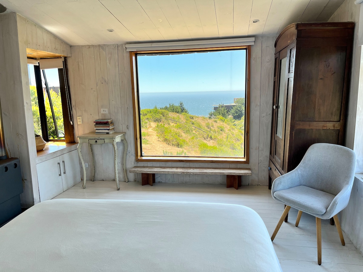 Acogedor refugio en doble altura(47mt2), de diseño único. Ideal para escapar del viento costero característico de la zona y disfrutar de templados valles, quebradas y naturaleza virgen. A pasos de la playa, restaurantes y supermercados. Servicio de HOT TUB $38.500 por estadías de 2 noches. Distancias: - A 2min de supermercado. - A 2,5km de La Vega de pupuya. - A 4km de Matanzas. - A 24km de Puertecillo. (40min) - A metros de Arena Pupuya Padel. En días de LLUVIA uso de 4x4 es requerido.