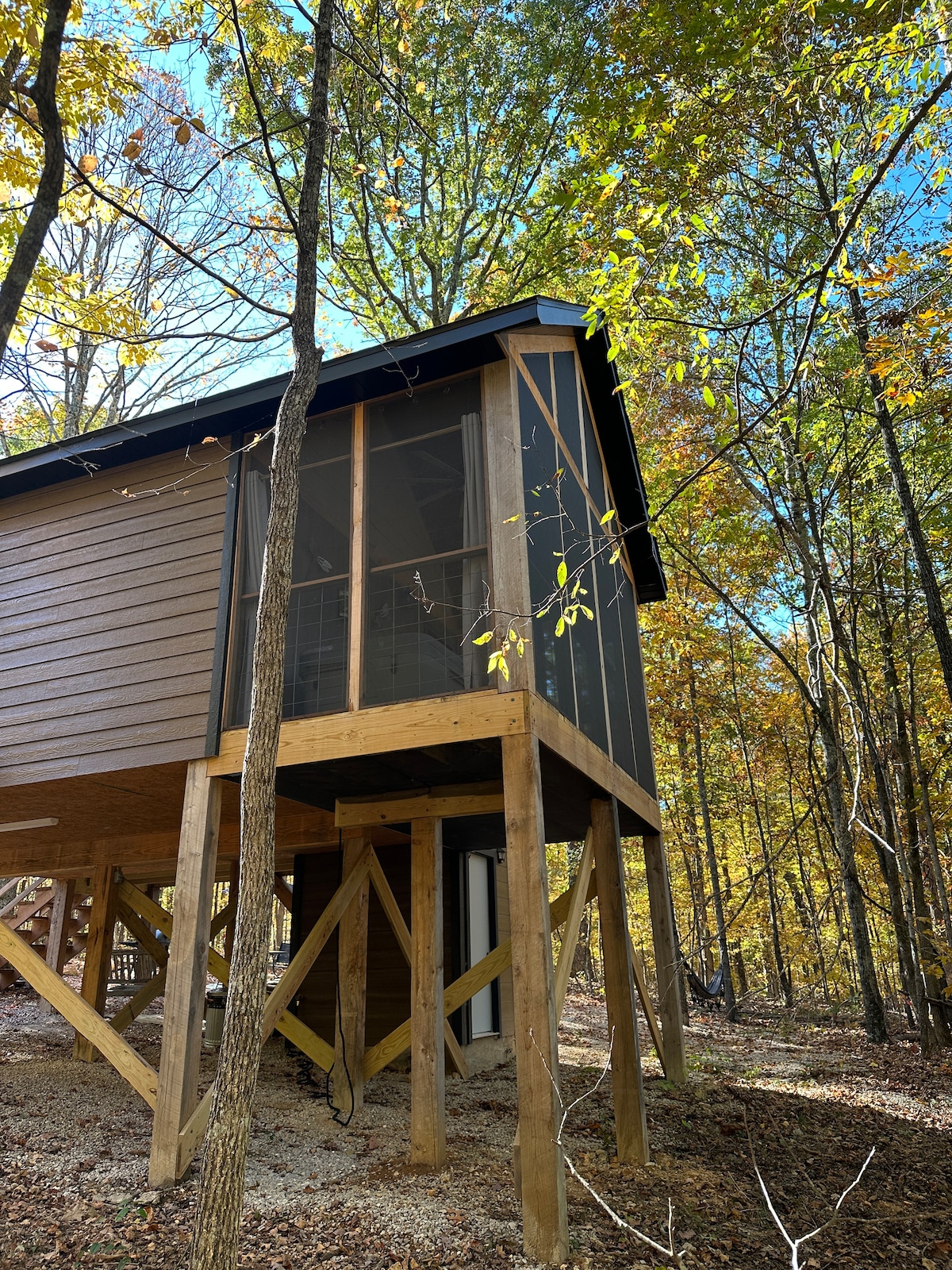 "The Roost" es una moderna casa del árbol a 2 horas al sur de St. Louis, cerca del lago Wappapello. Sí, tiene plomería interior y agua corriente. Tiene capacidad para dos adultos, cuenta con una cocina totalmente equipada y se proporcionan artículos de desayuno para que los cocines. Rodeado de miles de acres de bosque nacional. Observe los avistamientos de vida silvestre desde la terraza mientras se sumerge en el jacuzzi privado, duerma cómodamente en una cama Serta tamaño queen con la parte superior acolchada sobre una base Motion Air y relájese mientras disfruta del ambiente de la chimenea.