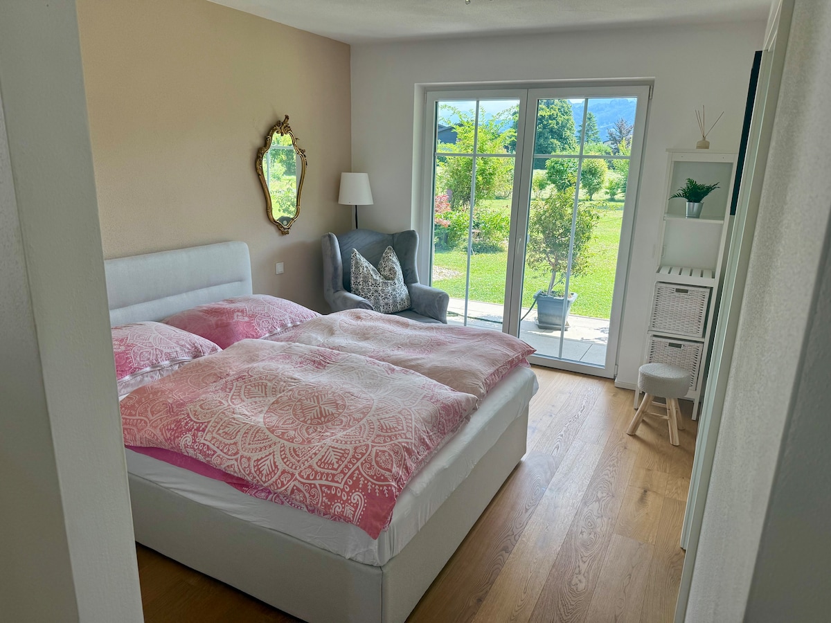 Sunny 65 m² holiday apartment in a prime location with breathtaking views of the Berchtesgaden Alps. The apartment offers a living room with a cosy sofa and TV, a fully equipped kitchen with dining area, a large bathroom with bathtub/shower, and a separate toilet. The bedroom features a double bed made of two single mattresses. Relax in the garden. Free parking and a guest card with local discounts are included – ideal for nature lovers and guests seeking peace and quiet.