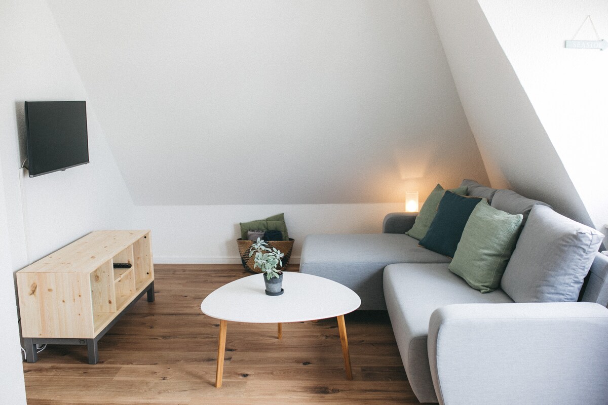 Perfecto para el trabajo a distancia o para unas acogedoras vacaciones en pareja. ¡Se ADMITEN perros! Apartamento ático tranquilo y moderno con vistas al mar (o dependiendo de la marea con una maravillosa vista de watt) en Cuxhaven Duhnen incl. WiFi de alta velocidad (perfecto para aquellos que quieren disfrutar de hermosas noches de Netflix (Smart TV) o trabajar desde aquí). A solo 150 metros de la playa, las marismas y el agua y muy cerca hay excelentes restaurantes, una panadería y heladerías.