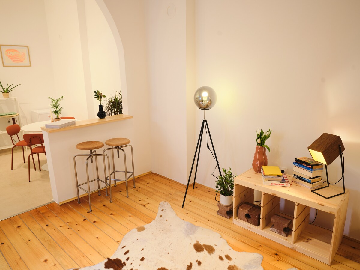Bienvenido al nuevo y soleado estudio loft con balcón en el centro de la ciudad de Belgrado. Inspirado en principios de diseño minimalistas e innovadores, este espacio presenta una mezcla excepcional de espacio abierto, líneas limpias y materiales meticulosamente elegidos, principalmente de notables marcas yugoslavas y escandinavas. Con su abundante luz natural, refrescantes acentos verdes y diseño eficiente, este estudio compacto pero espacioso ofrece un refugio ideal para estancias cortas en la ciudad.