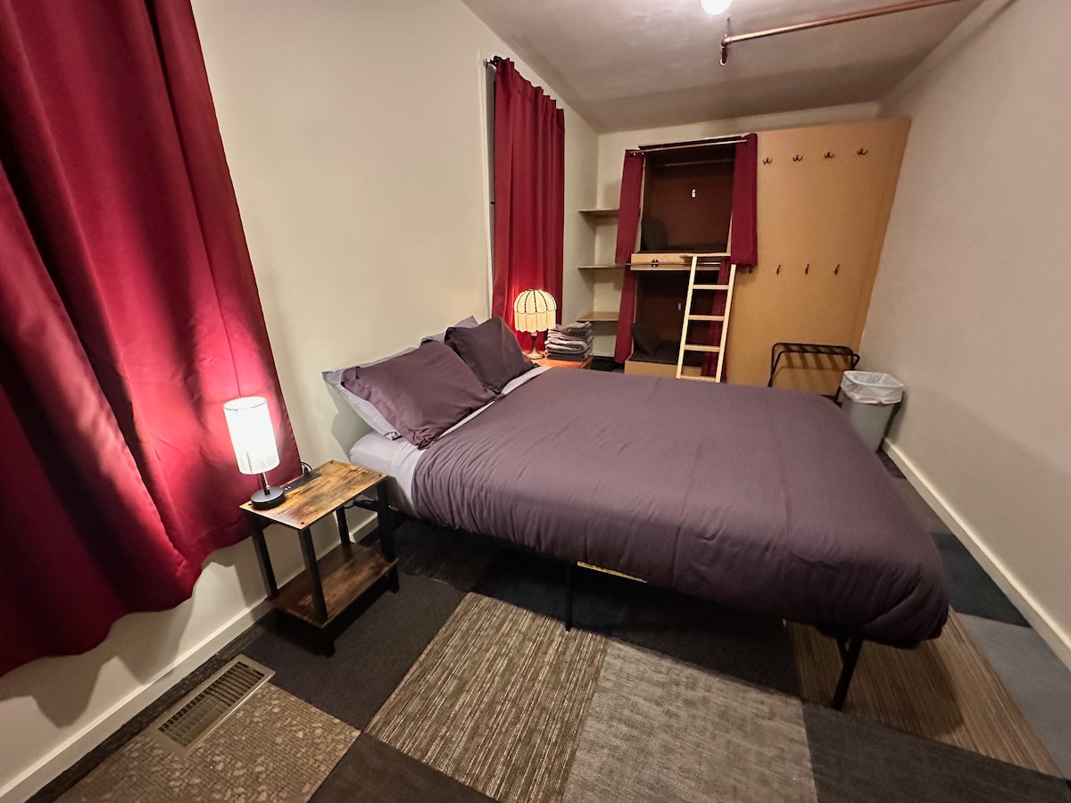 Habitación privada con una cama tamaño queen y 4 literas individuales. Hay baños compartidos al final del pasillo. The West River House es un hotel histórico asequible en el centro de Truckee, a poca distancia a pie de bares, restaurantes y el río. Es perfecto para aquellos que buscan explorar y relajarse sin distracciones. Aunque no hay televisión, el wifi gratuito es súper rápido. Hay fotos de 2 habitaciones diferentes en la publicación. Solo hay 1 de estas habitaciones disponibles por reservación. No se permiten fumadores ni mascotas.