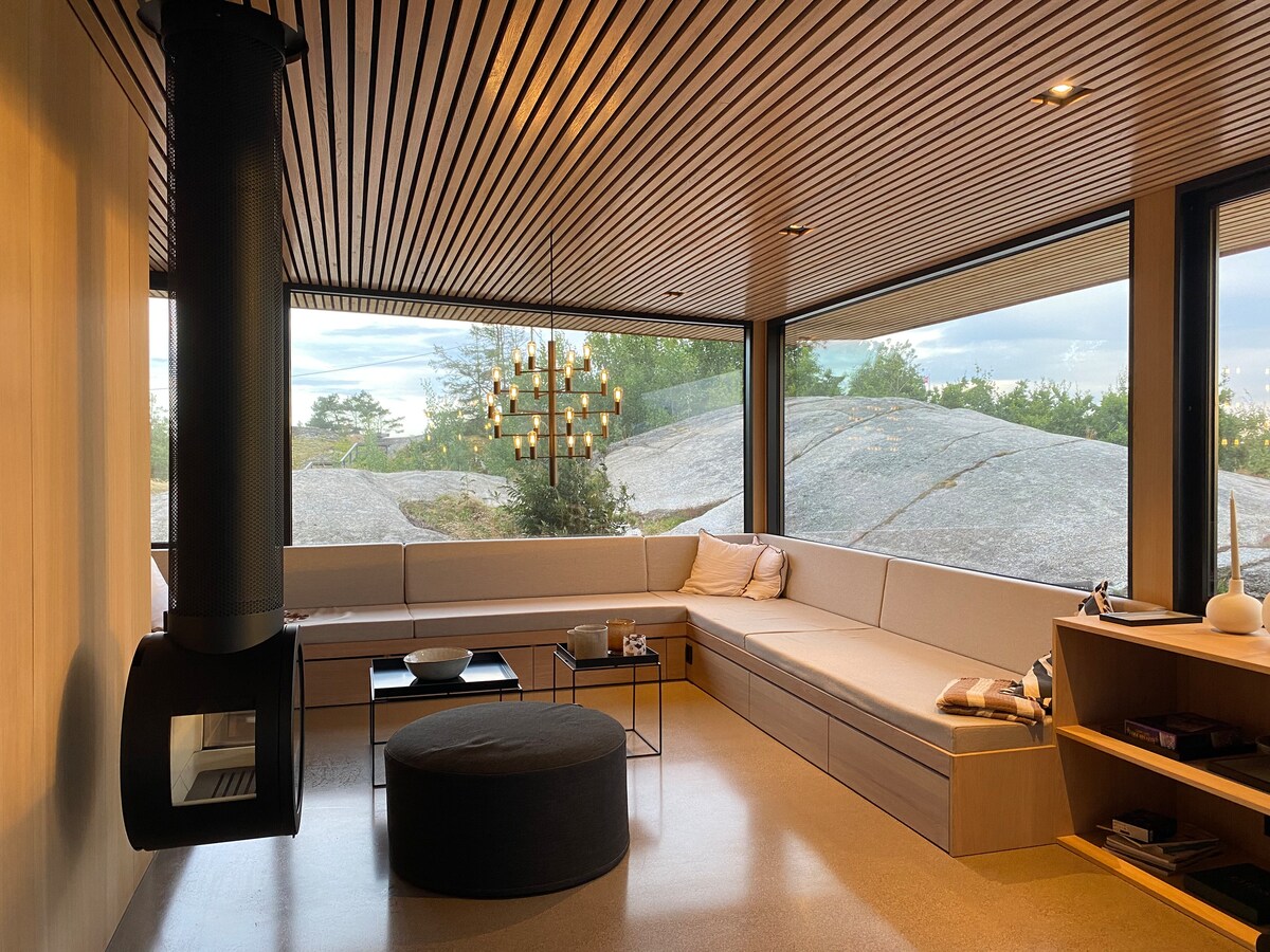 Unique and modern nordic design. idyllic and undisturbed surroundings in harmony with nature. Panoramic view over the fiord. 20 min. from Sandefjord/1,5 hour from Oslo/1,5 hour from Kongsberg alpin. The beach in front is Bronnstadbukta, area with rich nature, perfect for adults and kids. Great hiking right outside, with numerous popular summit hikes and hiking trails. Beautiful fjord with islets and reefs if you travel by boat. Cabin also suitable for two families with 2 baths ans 4 bedrooms.