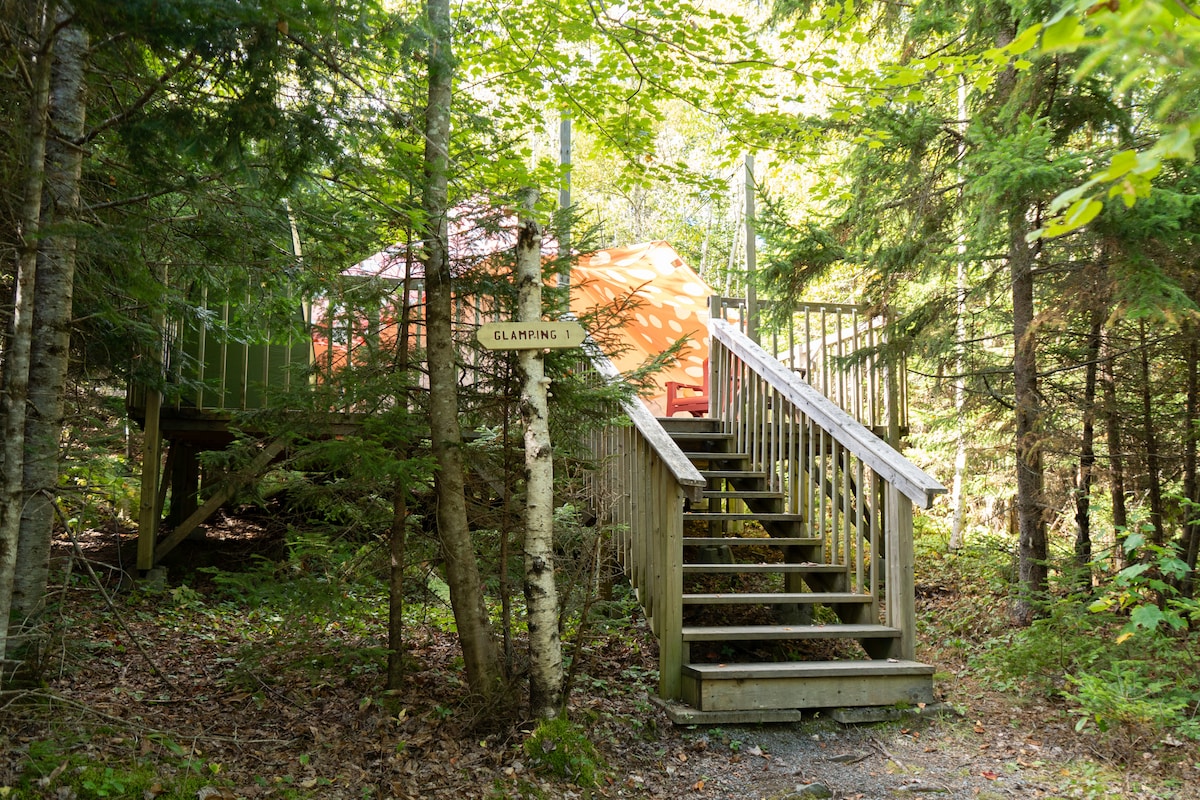 Tobique Traditions Glamping ofrece una escapada ecológica en el río Tobique. Este retiro con energía solar combina la comodidad moderna con la naturaleza. Los huéspedes se alojan en tiendas glamping con lo esencial, minimizando la huella de carbono. El entorno sereno, rodeado de bosques y aguas tranquilas, es perfecto para los amantes de la naturaleza y la relajación. Dos tiendas comparten un baño con ducha completa, lavabo al aire libre e inodoro de incineración, que funciona como un inodoro normal pero incinera los desechos en lugar de usar agua.
