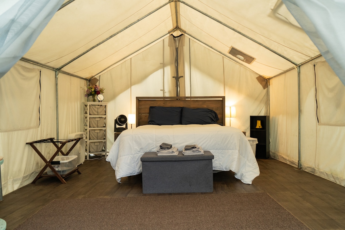 Nuestras grandes tiendas de campaña tienen una cama tamaño queen con colchones suaves y sábanas de calidad, muebles de pino, ventiladores, calentadores y luces eléctricas. Hay una terraza elevada con sillas al aire libre y un pequeño recinto con un inodoro portátil y lavabo. Un corto paseo te lleva a baños y duchas compartidos. Nuestros jacuzzis bajo las estrellas están cerca (reserva tu tiempo en nuestro sitio web). Ten en cuenta que los huéspedes deben caminar una corta distancia cuesta arriba para llegar a las tiendas de campaña glamping.