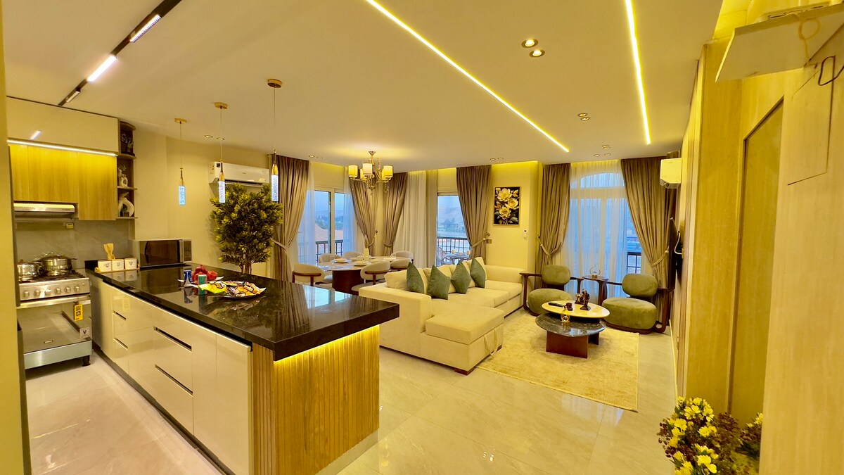 Disfruta del lujo boho moderno en este nuevo apartamento (octubre de 2025) ubicado en la prestigiosa West Golf Extension, New Cairo, a pocos minutos de 5A Walkway, Cairo Festival Mall y los vibrantes lugares de Katameya. Disfruta de un dormitorio principal presidencial, 4 televisores inteligentes, aire acondicionado oculto, persianas eléctricas y electrodomésticos completamente nuevos en un espacio luminoso y elegante. Perfecto para los huéspedes que buscan comodidad, estilo y una experiencia de lujo en El Cairo.