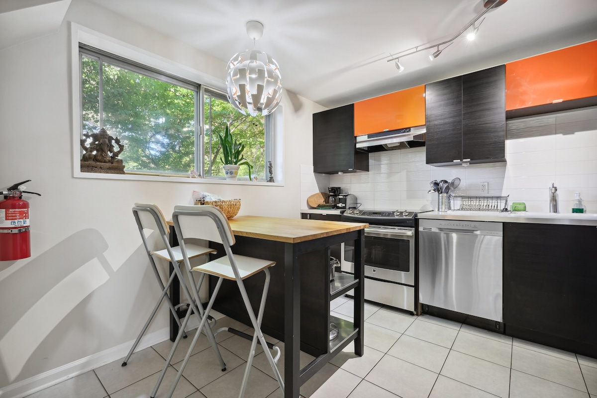 Este apartamento con su propia entrada privada se encuentra debajo de nuestra casa de ladrillo. La unidad está totalmente renovada con comodidades de lujo. Es un ambiente acogedor de cabaña bohemia con un toque de magia. Cuenta con una cocina completamente equipada con lavavajillas, una amplia sala de estar y un dormitorio con una cómoda cama tamaño king y un baño privado con ducha a ras de suelo. Estacionamiento fuera de la calle, Internet rápido y sofá cama para huéspedes adicionales.