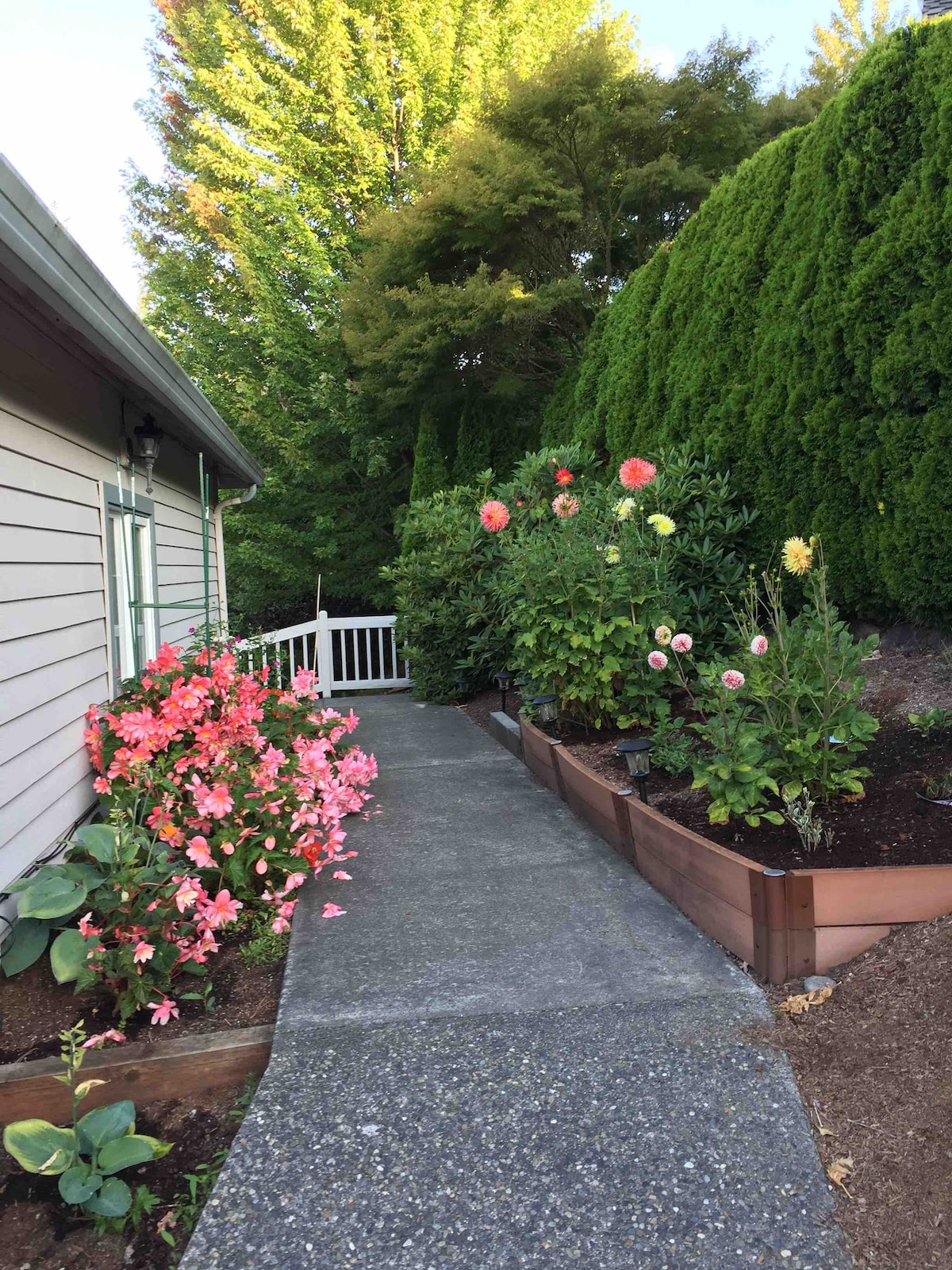 Esta encantadora casa de huéspedes se encuentra en el tranquilo vecindario del centro de Bellevue e incluye todas las necesidades para unas vacaciones cortas: hermosa vista al jardín en el lado de la cama, gran privacidad sin paredes compartidas con el edificio principal, cocina completa para cocinar en casa, lindos conejitos de mascotas en el jardín, etc. Ubicación conveniente: a poca distancia de tiendas de comestibles y restaurantes, o a <4 millas de parques de playa, jardín botánico, parques agrícolas. Acceso en autobús al campus de Microsoft, Washinton U o al centro de Seattle.