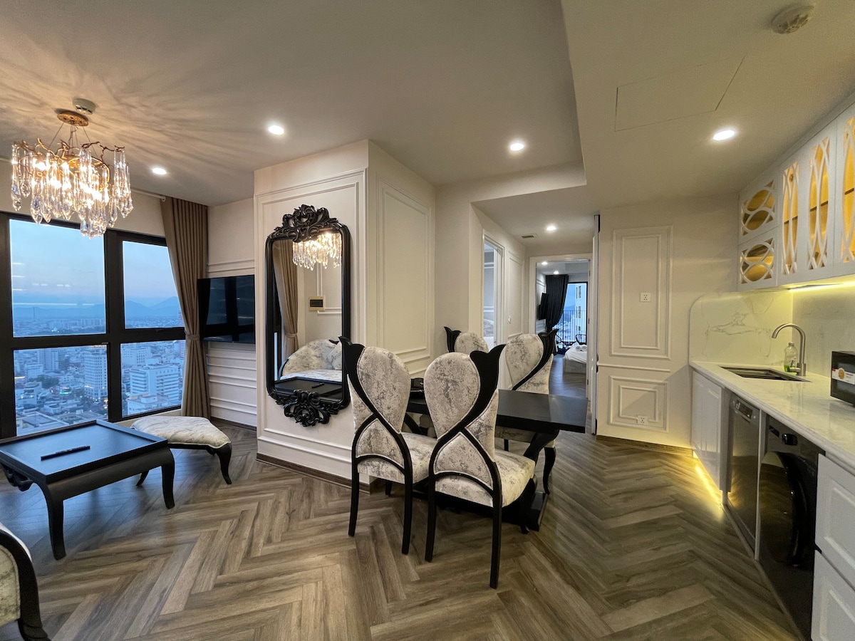 Căn hộ thiệt kế nội thất cao cấp và sang trọng, có sofa dài và có bàn ăn, căn hộ có ban công để ngắm biển và có thể hút thuốc được. Căn hộ có tủ lạnh siêu to, Smart TV 65inch, và đặc biệt có bồn tắm mát- xa Jacuzzi Bên dưới căn hộ có 12 tầng trung tâm thương mại các nhà hàng và cafe, có siêu thị Lotte ở tầng 3 và 4, buffet tầng 5, vui chơi trẻ em tầng 7, tiêm chủng VNVC tầng 10. Có hồ bơi vô cực ở tầng 12A và sử dụng với chi phí khoảng 350.000/vé cho 1 khăn tắm, 1 ly nước trong 4 giờ đồng hồ