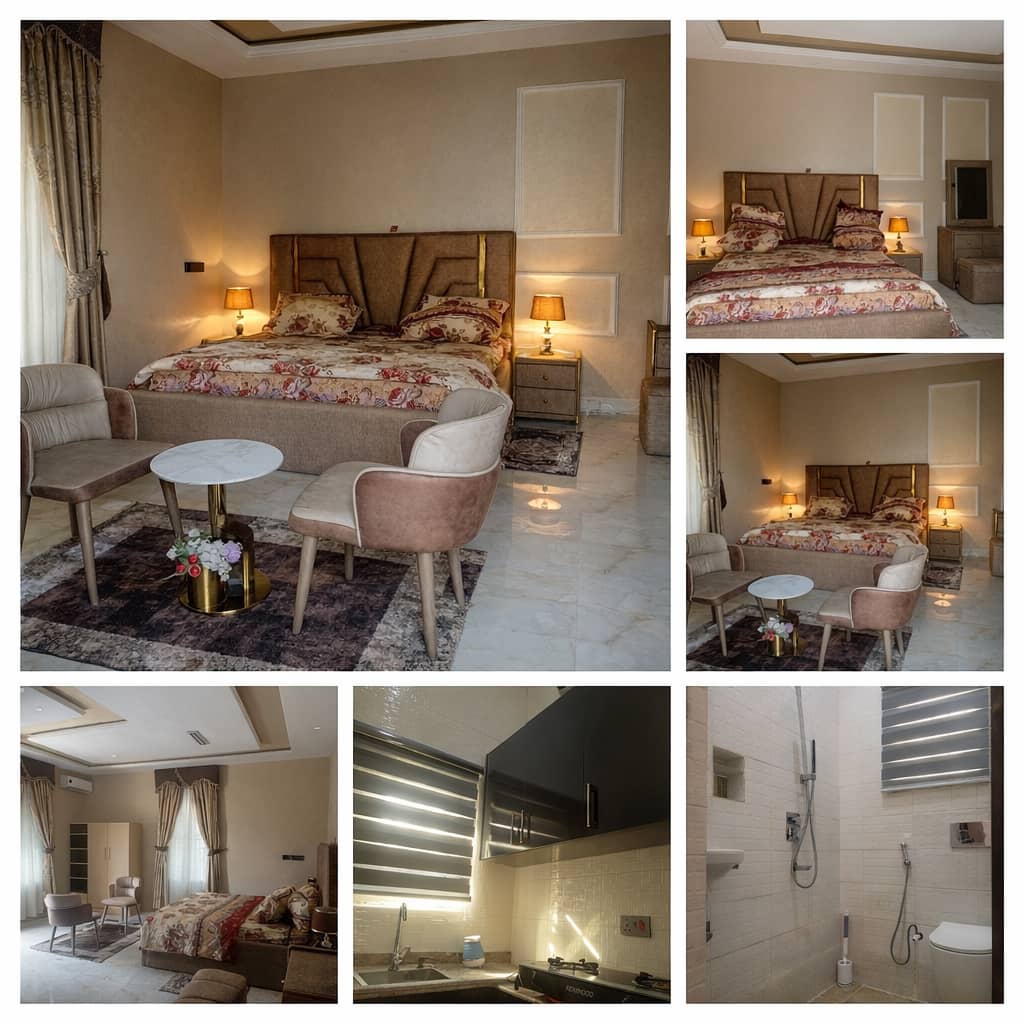 A very sensational one bedroom apartment located inside one of best estates here in the city of ilorin, evergreen estate. Features; 1. Free unlimited internet 2. Dstv premium subscription 3. Air conditioning (only nepa) 4. 24/7 power supply 5. Fully equipped kitchen. 6. Netflix 7. Amazon prime 8. PS5 (on request) 9. Serene environment 10, Home keeping services Added services: free laundry service and complimentary breakfast. Location: Evergreen Estate off Taoheed Road.