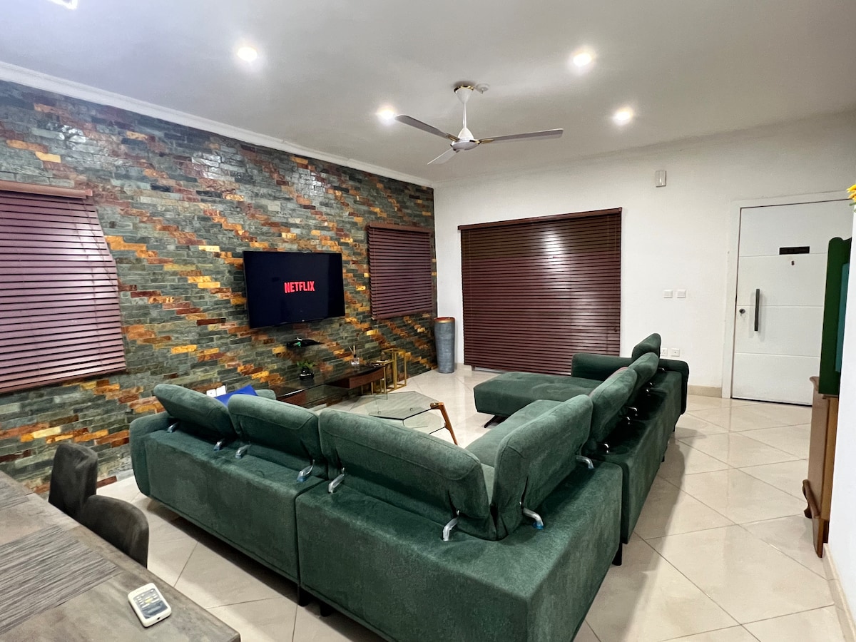 Relax in downy stairs apt. family members and friends at this peaceful 4 different unit villa . You will have 1 unit for your self unless you booked the whole Villa It’s equipped with CCTV cameras, electronic fence with alarm systems, burglar proofing on all windows and security doors at the doors Solar panels for energy, Starlink Internet and solar lamps on the compound. Closer to Tema, airport, Accra mall, Akosombo, Ada , Accra central, beaches etc Airport pickups and rentals