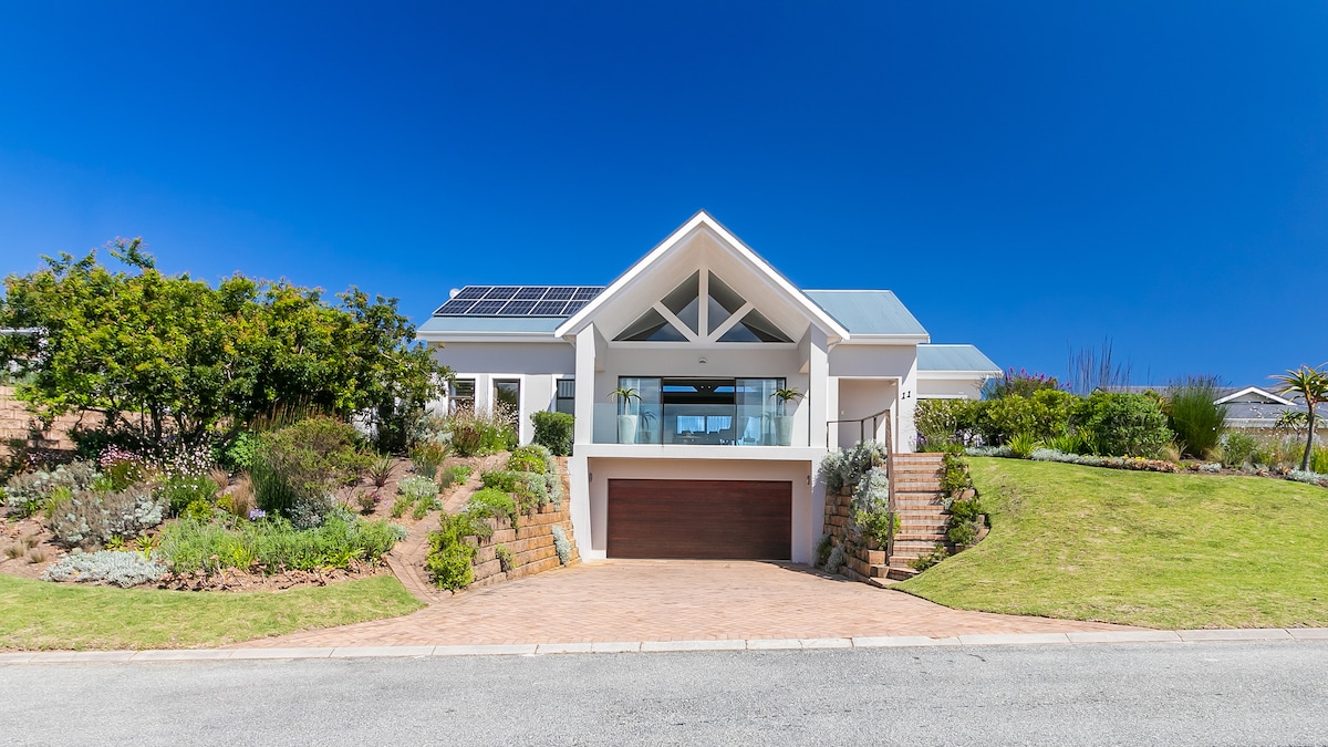 Vistas de 180 grados (solar para la seguridad energética) de la impresionante laguna de Knysna en un barrio tranquilo. ¡Acabados de primera en una casa nueva! Precioso jardín y piscina. Terraza soleada para disfrutar de las vistas y una chimenea para añadir ambiente y calidez en las noches más frías. Muy cerca de la ciudad, pero tranquilo y privado. Braai/barbacoa para cocinar y cenar al aire libre en las muchas noches hermosas. Las reseñas de todos nuestros huéspedes lo dicen todo y el 75 % de nuestros huéspedes son viajeros internacionales exigentes.