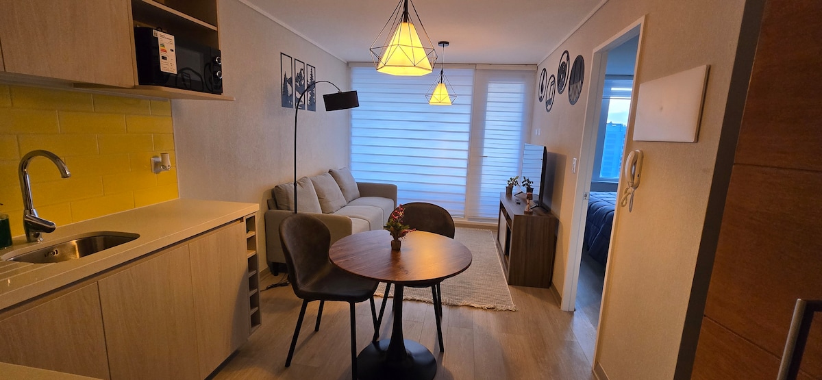 Departamento nuevo, céntrico, cómodo, limpio, seguro, moderno, amoblado, dos ambientes, equipado para 3 personas, consta de una habitación con una cama matrimonial de 2 plazas y un sofá cama. Además posee tv cable, wifi, terraza, calefacción, parrilla eléctrica, gimnasio, conserjería, 24hrs, estacionamiento, lavandería ( lavadoras y secadoras ) locomoción a la puerta, cercano a supermercados y universidades, centro de Concepción, ubicado frente a estadio Collao, a pasos del terminal Collao