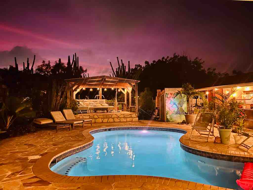 ¡Casa única de estilo Aruba, incluida la piscina, la cocina al aire libre y el inodoro / ducha al aire libre para 6 (hasta 8) personas ubicadas en el encantador, lujoso y tranquilo vecindario de Monte Verde Residence! Relájate en esta hermosa isla y visita Oranjestad, las playas y la naturaleza virgen desde una ubicación céntrica (¡todo accesible entre 5 y 10 minutos!).