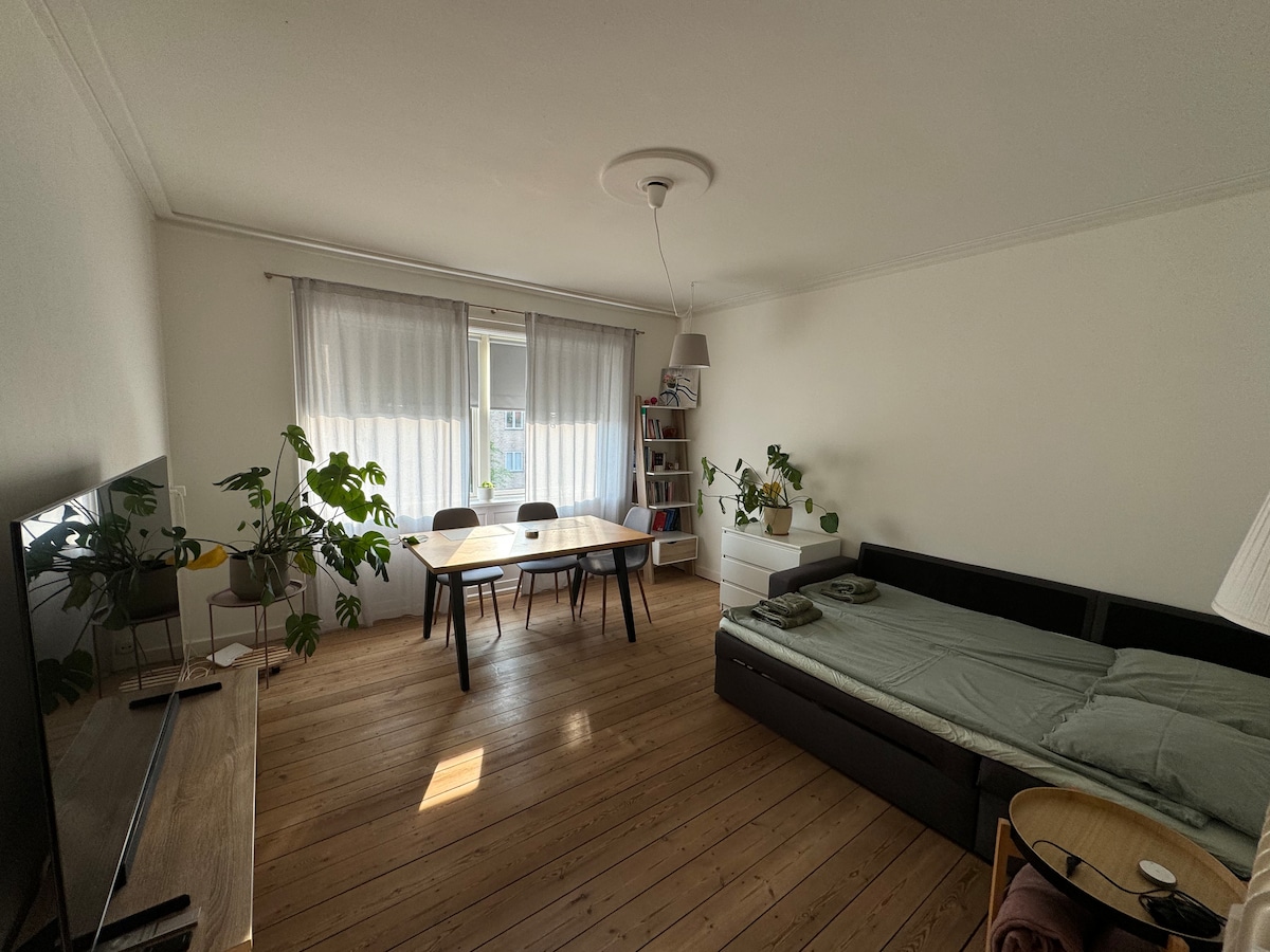 A cozy apartment in the center of Frederiksberg in Copenhagen. With an open kitchen / living area you can enjoy the light from both sides throughout the day. Sunrise and sunset. Newly renovated with one bedroom and a New Yorker inspired livingroom, with a couch and a daybed. it can accommodate up to 4 people. Metro, Busses, restaurants, cafes and shops on the street, in this urban area filled with life, green fields, galleries, bars & Drink places - In the center of it all.
