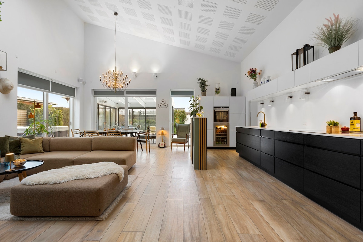El apartamento de 110 metros cuadrados ha sido completamente renovado en un estilo nórdico moderno y cuenta con suelos de madera dura Dinesen con calefacción, accesorios Vola, una cocina de roble y granito y muebles de diseño danés. El aspecto más impresionante es la azotea privada de 50 metros cuadrados con una bañera climatizada con vistas al horizonte de Copenhague.