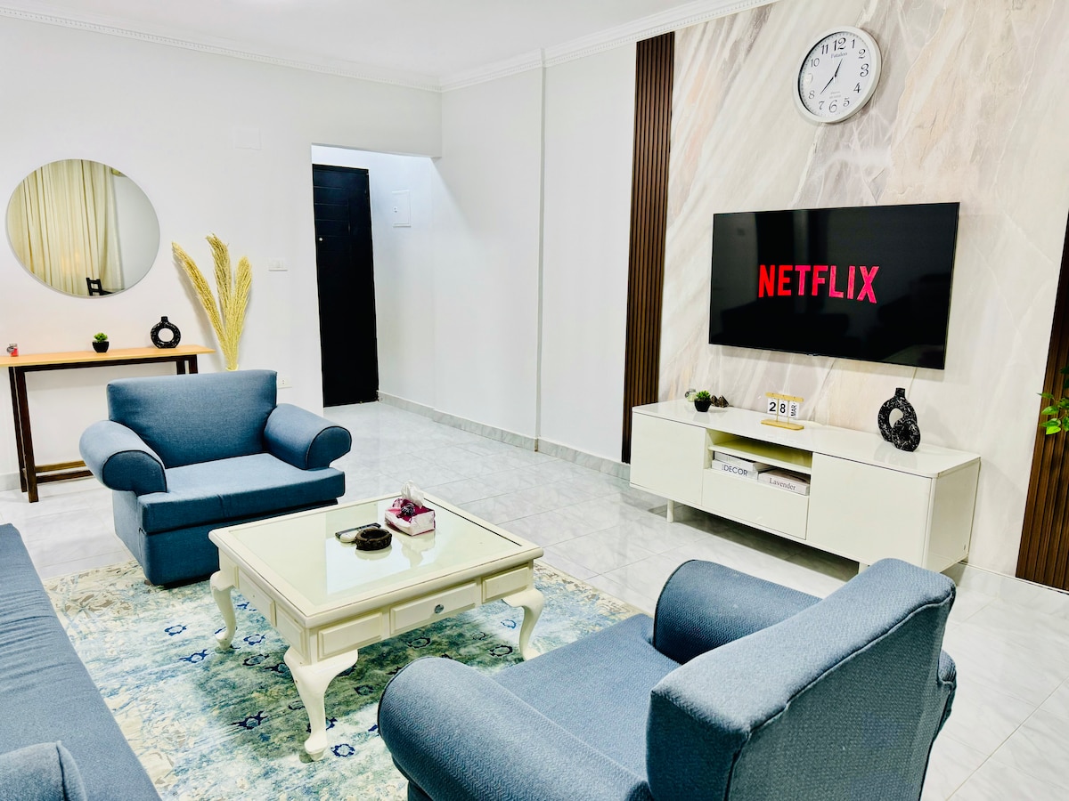 Disfruta de una experiencia elegante en este lugar céntrico. ofrecemos asistencia gratuita para el equipaje 🧳. A 3 minutos en coche de Al Rehab y a 1 minuto a pie del complejo Garden 8. Restaurantes internacionales, supermercados, bares y farmacias a 1 minuto a pie. La privacidad está garantizada con la llegada autónoma Estamos encantados de darte la bienvenida a nuestra unidad en el cuarto piso de nuestro encantador edificio. Si bien no hay ascensor, puedes estar seguro, nuestro representante dedicado estará disponible para ayudarte con tu equipaje.