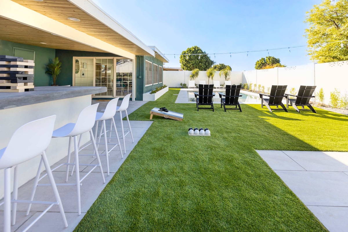 La Casa Turquesa Norte es una escapada bellamente diseñada y bien equipada. Está directamente al lado de la «Turquoise House South» y se puede alquilar simultáneamente para grupos más grandes. Esta casa ha sido completamente remodelada por dentro y por fuera con toques elegantes y modernos. El patio trasero cuenta con un putting green de césped artificial, barbacoa, piscina grande poco profunda, solar, L2EV y juego de lanzamiento de sacos de frijoles. Cerca de Kierland, tiendas, restaurantes y mucho entretenimiento. Ciudad de Phoenix Reg #2020-0550