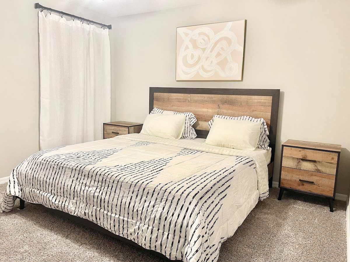 Muy limpio. Hay MUEBLES nuevos y una cama tamaño king y una cama tamaño queen. Hay un televisor inteligente de pantalla plana grande de 75 pulgadas en todas las habitaciones. La cocina se ha reformado con armarios nuevos y encimera de cuarzo. Nuevos tocadores, inodoros y baños actualizados. 2 baños COMPLETOS. Ducha a ras de suelo y combinación de bañera y ducha. INTERNET WIFI, servicios públicos, aparcamiento, paquete de TV, Smart TV. Los códigos de la cerradura inteligente se cambian para todos los huéspedes.