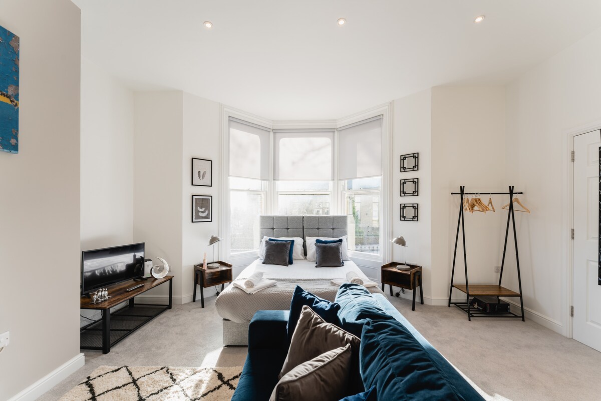 Self contained Studio in great locality. Free parking & short 10/15min pedestrianised riverside walk to City. Recently refurbished to a high standard. Light spacious & airy. New kitchen, new bathroom, recently decorated throughout. Lovely bay window with comfortable sitting area, feature fireplace. King sized sofa bed along with neat and functional kitchen and bathroom with all utilities. Free Wi-Fi . Enjoy a clean and safe stay.