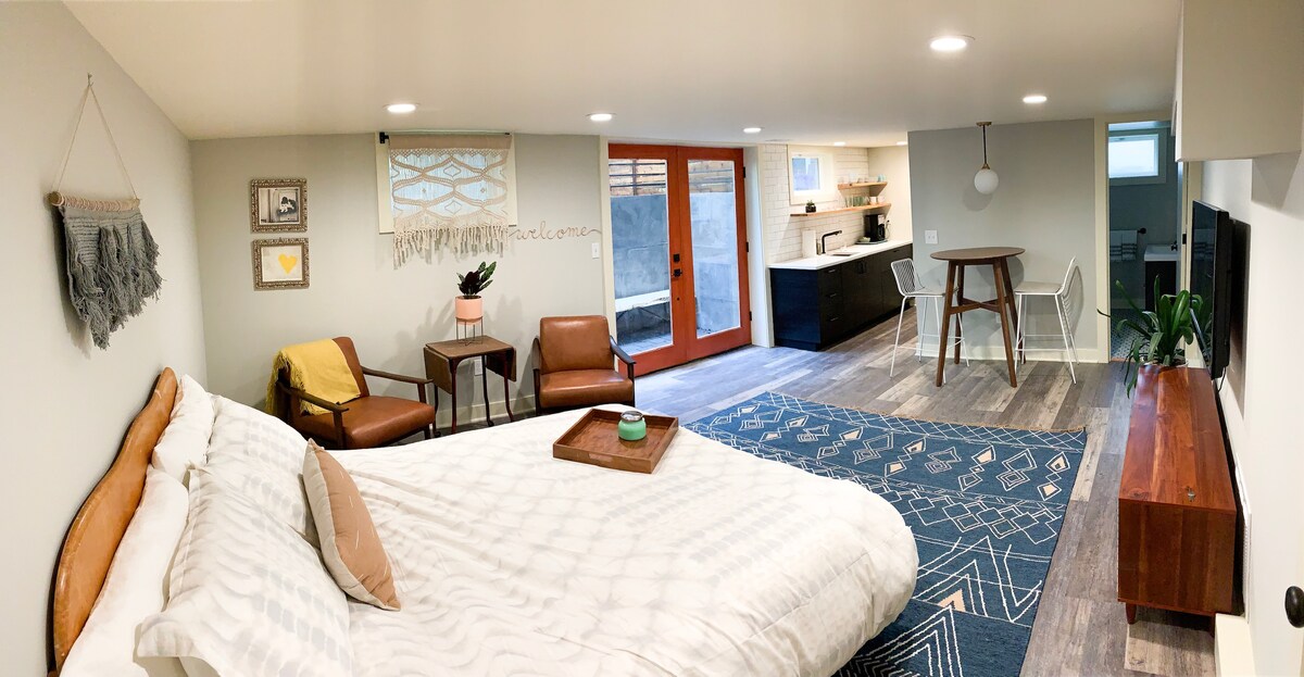 Apartamento tipo estudio diseñado con lo esencial para relajarse. Ponte cómodo junto a la chimenea de gas con un libro de nuestra pequeña biblioteca, trabaja en tu computadora portátil en el rincón del escritorio o haz un fuego al aire libre + mirada de estrellas en el patio. Disfruta del mobiliario de mediados de siglo, las bonitas sábanas y toallas y asegúrate de escribir una carta: las tarjetas de impresión tipográfica y los sellos son para tu uso. Barrio tranquilo con buen café (¡Bisontes!), a pocos pasos del desayuno (Beeswing) y cerca de Beaumont Village (¡Pip 's Donuts!). ¡A solo 10 minutos del aeropuerto!